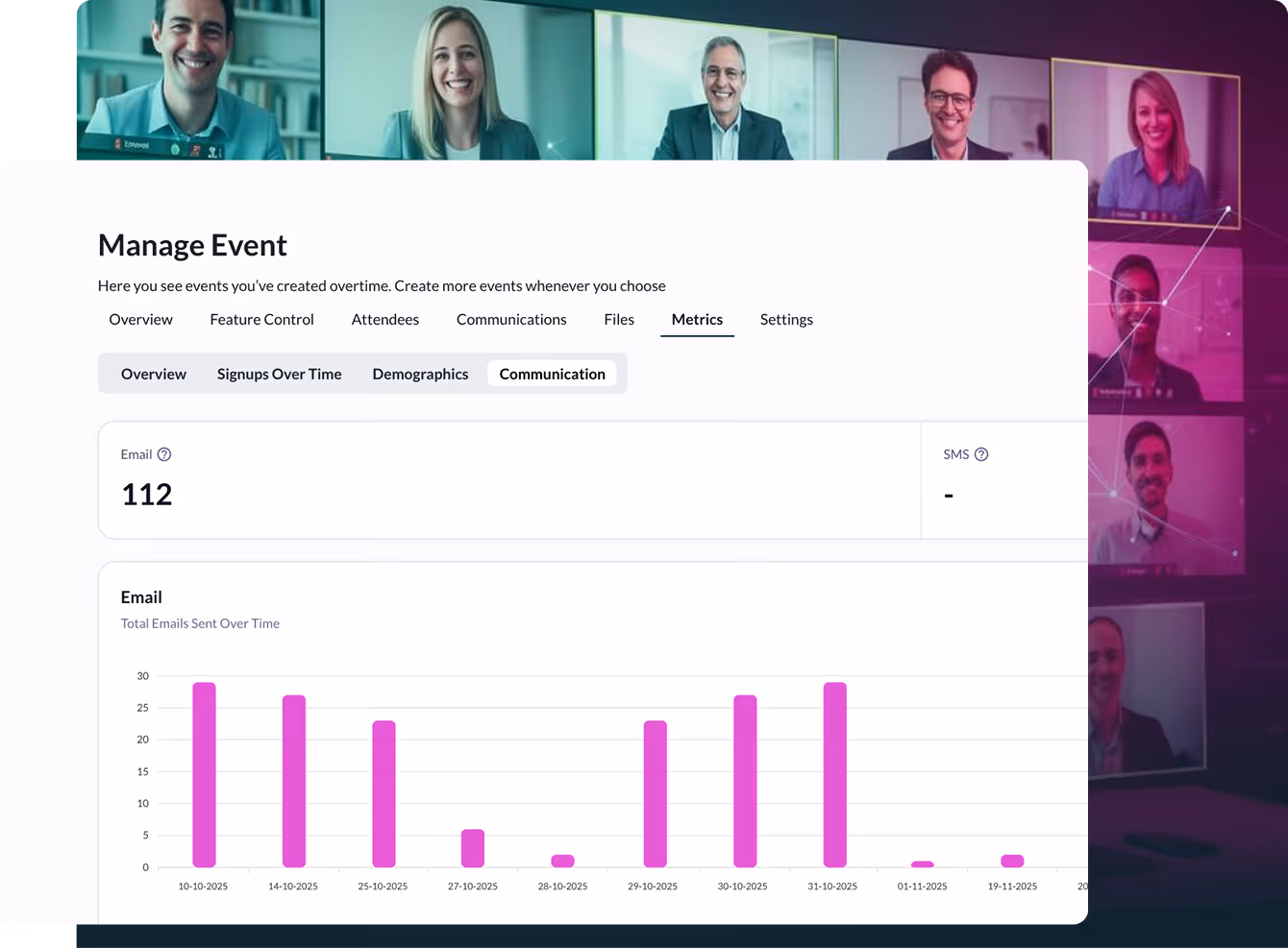NEXA is equipped with advanced features that ensure your events run smoothly. From GDPR compliance to live streaming, analytics, and branded event sites. Discover the tools that make event management simple, secure, and highly engaging.